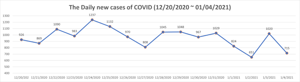 미국의 일일 코로나 최대 확진자 수 29만명, 사망자 수 3000명을 넘어서고 있습니다. 또한 전파력이 기존 바이러스보다 높은 변이 바이러스가 유행하는 영국에서는 일일 확진자 수가 6만명, 사망자는 천명에 육박하고 있습니다. 이렇듯 전세계는 가장 혹독한 겨울을 지나며 2021년을 맞이하고 있습니다. 몇몇 나라에서는 코로나 백신을 승인, 의료인과 노인 등 취약계층을 우선적으로 접종하는 등 긴 터널의 끝이 보이고 있습니다. 우리 모두의 협력을 통해 코로나를 극복하고 다시 일상의 기쁨을 누릴 그 날이 오기를 간절히 염원해봅니다.