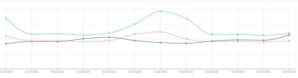 이에 크리스마스 전후 이동량의 변화를 알아보기 위해 전국 주요 고속도로 휴게소에 설치된 DFRC의 유동인구 분석 시스템인 LBASense를 활용했습니다. LBASense는 과거 수집된 데이터를 바탕으로 일일 예상 방문자를 산출합니다. 아래 그래프에서는 최소값을 빨간색 점선, 최대값을 초록색 점선으로 표시하였고 실제 방문자수를 검은색 실선으로 나타내었습니다.